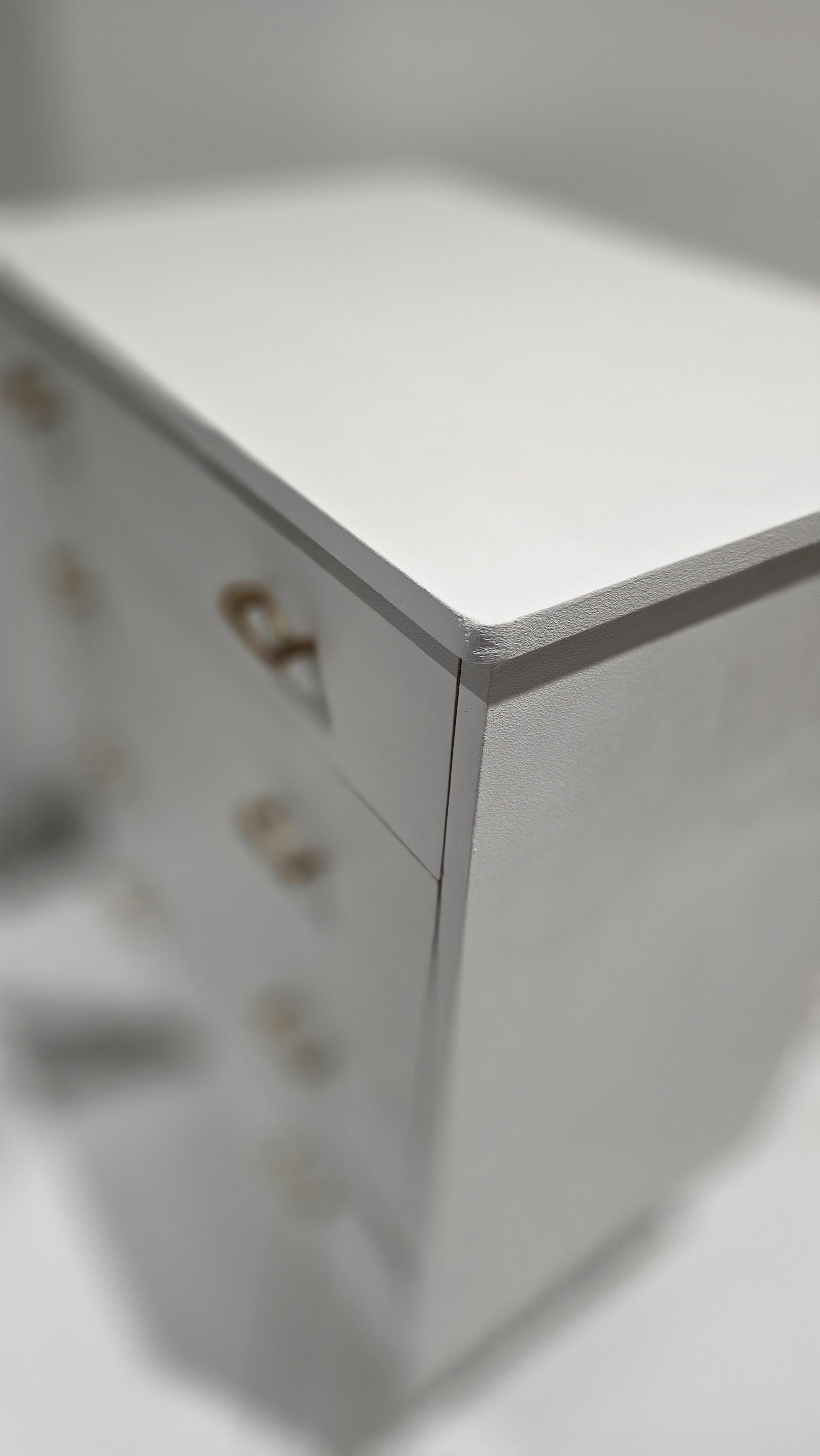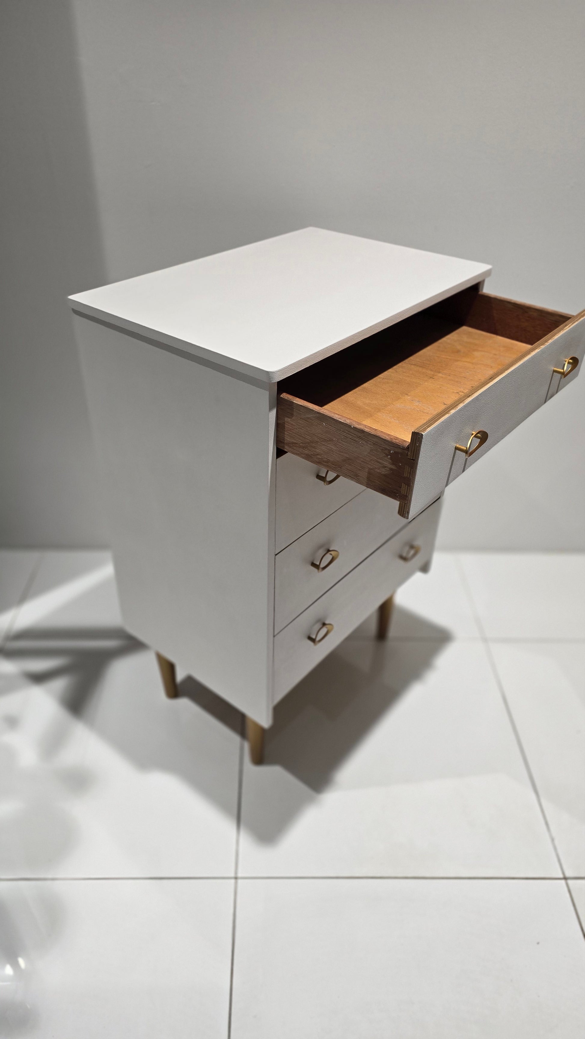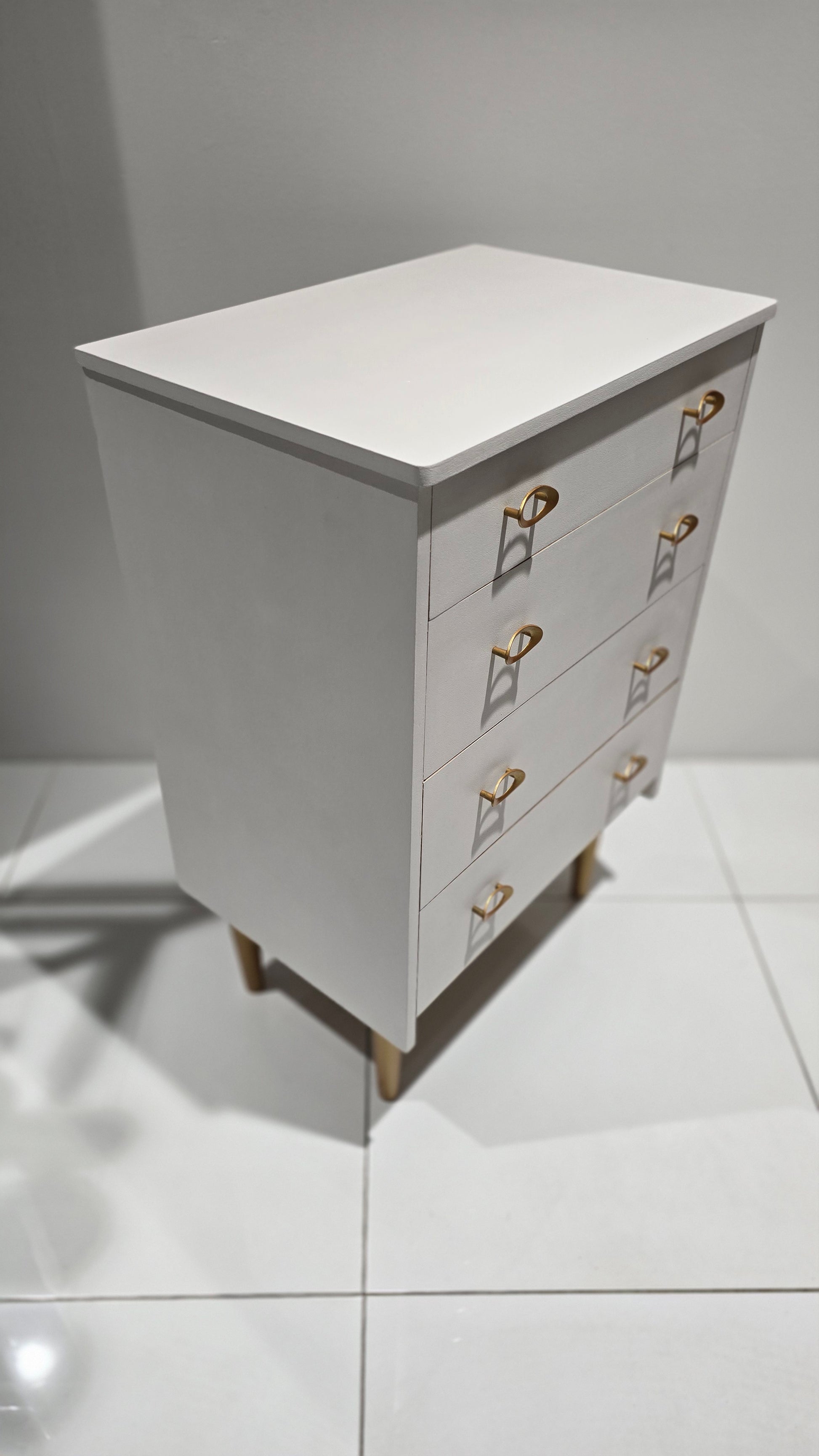 This elegant 4-drawer chest has been refinished in Rococo White, a soft and classic shade that brings timeless sophistication to any space. The original handles have been retained for authenticity, while the legs have been painted in gold, adding a touch of glamour and contrast to the crisp white finish.