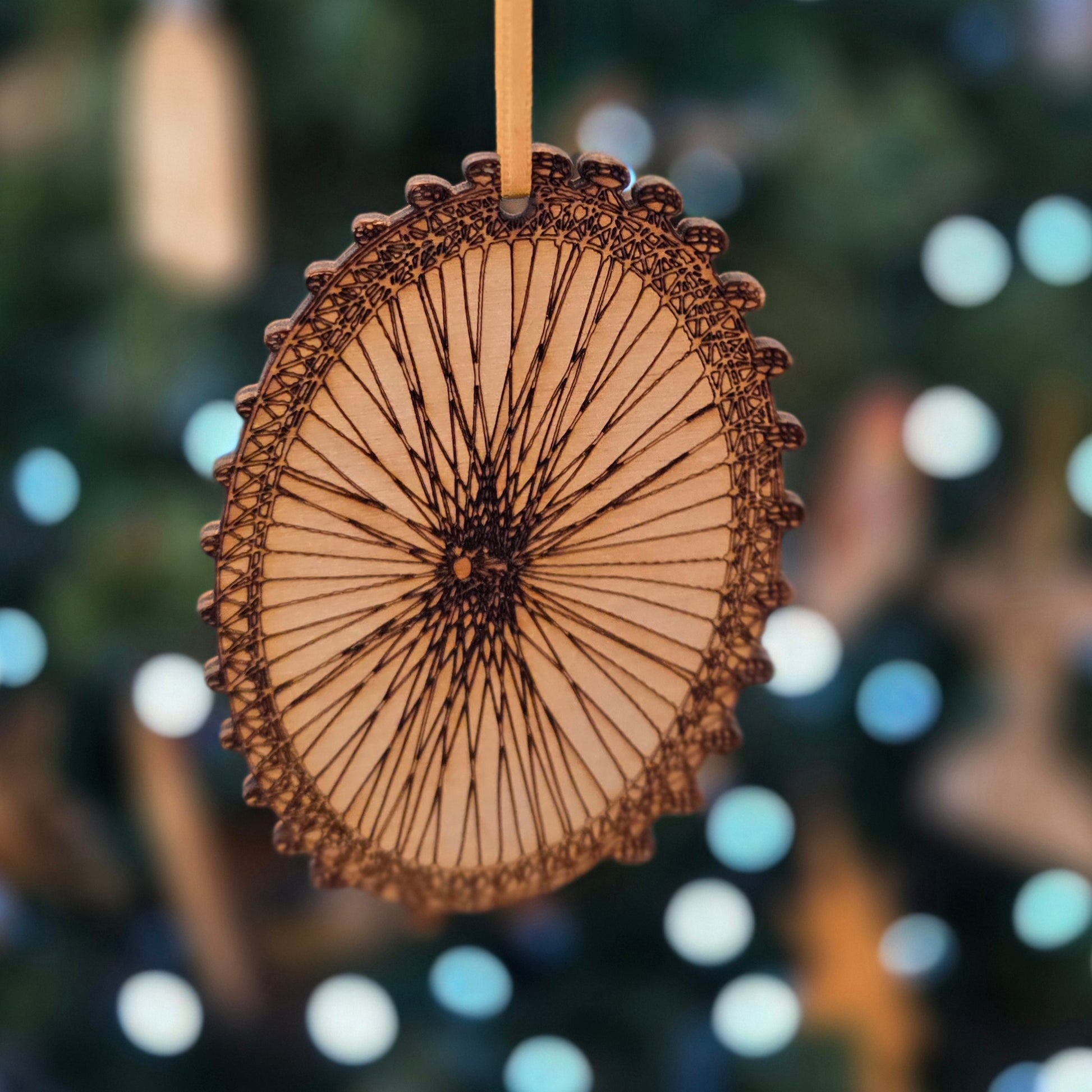 Add a modern twist to your festive décor with this beautifully detailed laser-cut Christmas ornament inspired by the iconic London Eye. Expertly crafted from high-quality wood, this piece captures the elegance of the famous riverside landmark, showcasing each spoke and capsule with remarkable precision.